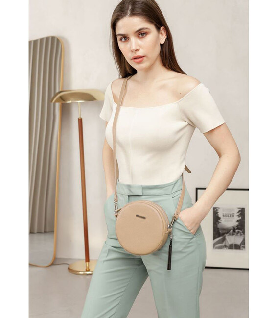 Описание Круглая женская кожаная сумочка Tablet светло-бежевая