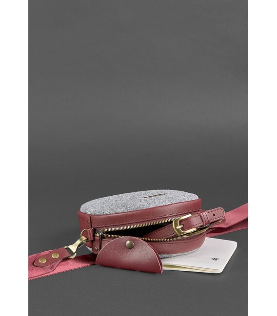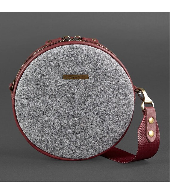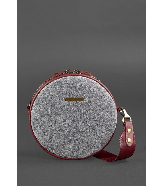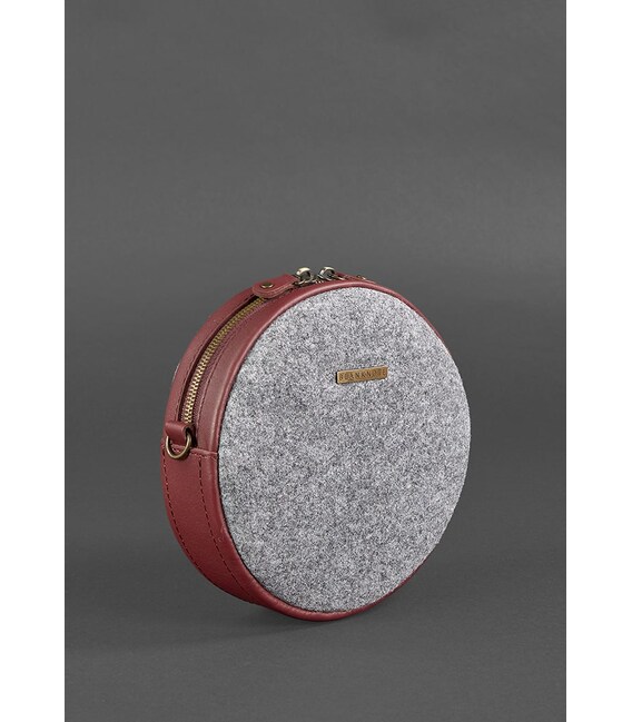 Круглая фетровая женская сумка Таблетка с кожаными бордовыми вставками