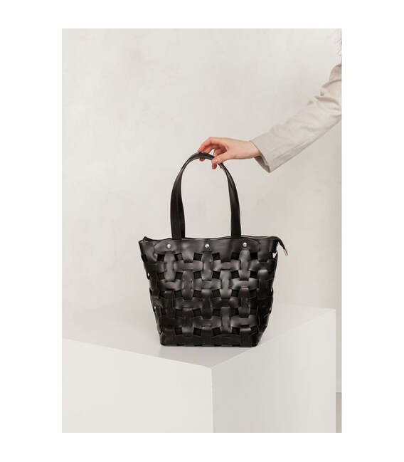 Описание Кожаная плетеная женская сумка Пазл L угольно-черная