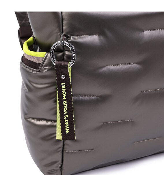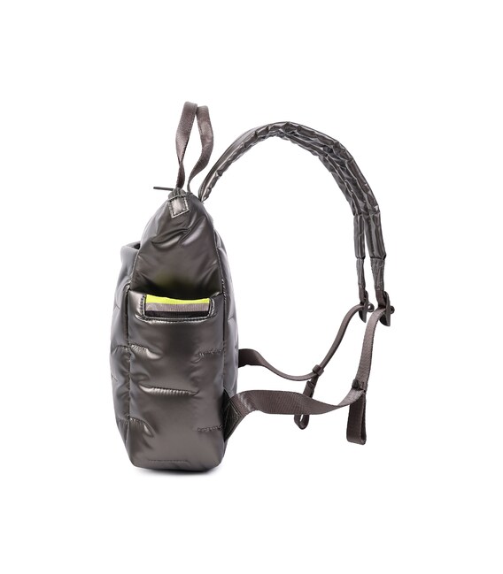 Вместительный, дутый рюкзак-идеальный спутник на каждый день. Оснащен большим основным отделением с внутренними карманами и съёмной косметичкой. С внешней стороны расположен карман на молнии, также есть боковые карманы для зонтика или бутылки с карабином для ключей. Выполнен из плотного 100% polyester.