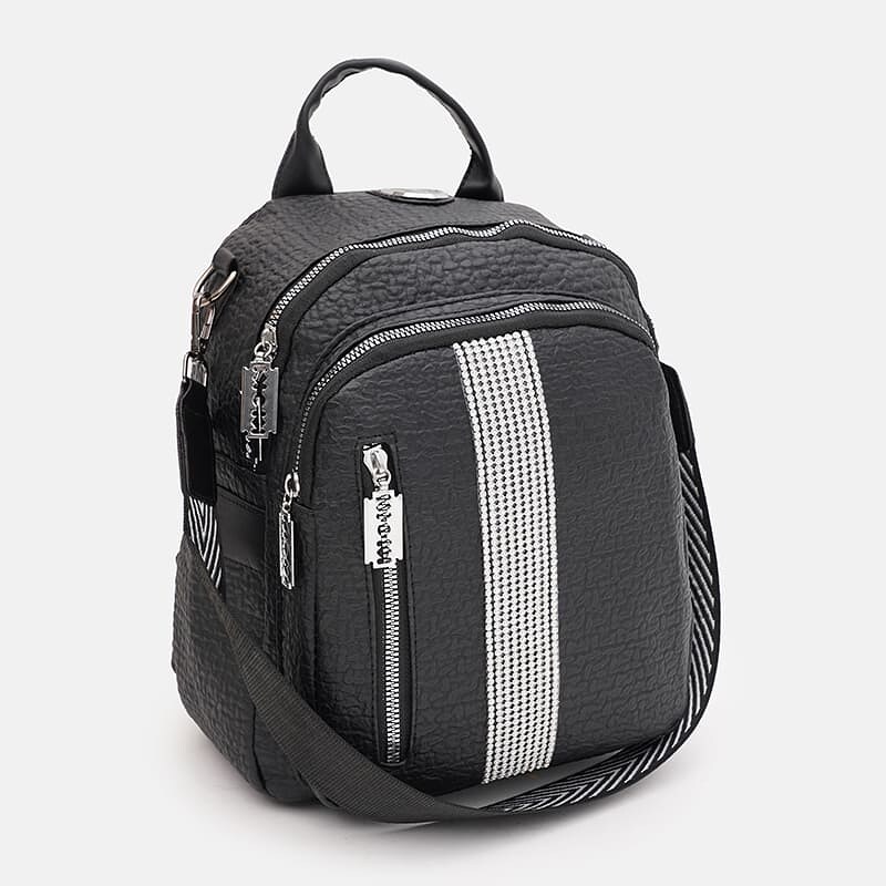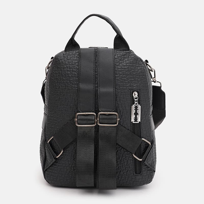 Женский рюкзак имеет 1 основное отделение, которое закрывается на молнию. С лицевой стороны - 2 кармана на молнии и 1 карман на молнии с тыльной стороны.Также есть 2 боковых кармана. Внутри имеется 1 карман на молнии и 2 кармана для телефона и других мелочей. Подкладка текстиль. Ручки выполнены из искусственной кожи, в комплекте съемный плечевой ремень.