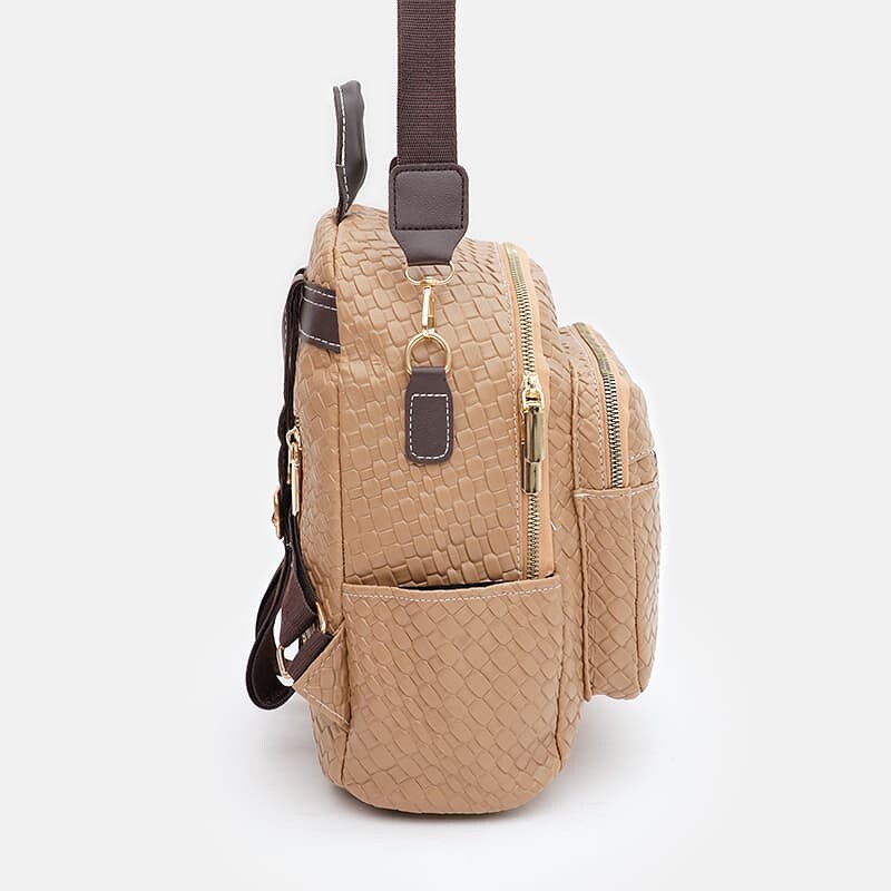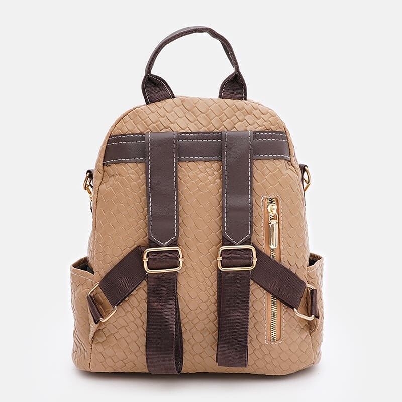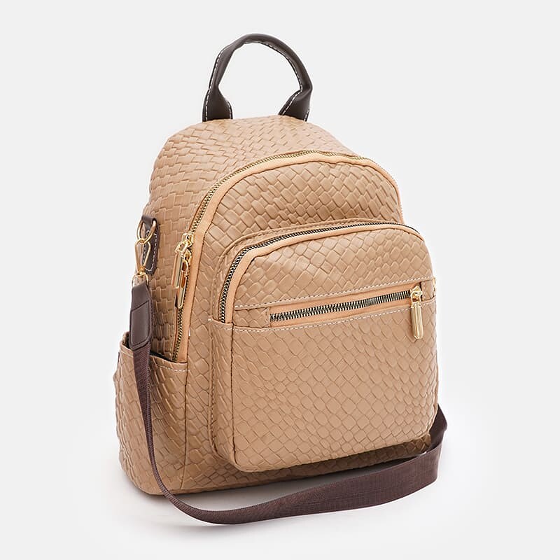 Женский рюкзак имеет 1 основное отделение, которое закрывается на молнию. С лицевой стороны - 2 кармана на молнии и 1 карман на молнии с тыльной стороны. Имеется 2 боковых кармана. Внутри - 1 карман на молнии и 2 кармана для телефона и других мелочей. Подкладка текстиль. Ручки выполнены из искусственной кожи,в комплекте съемный плечевой ремень.