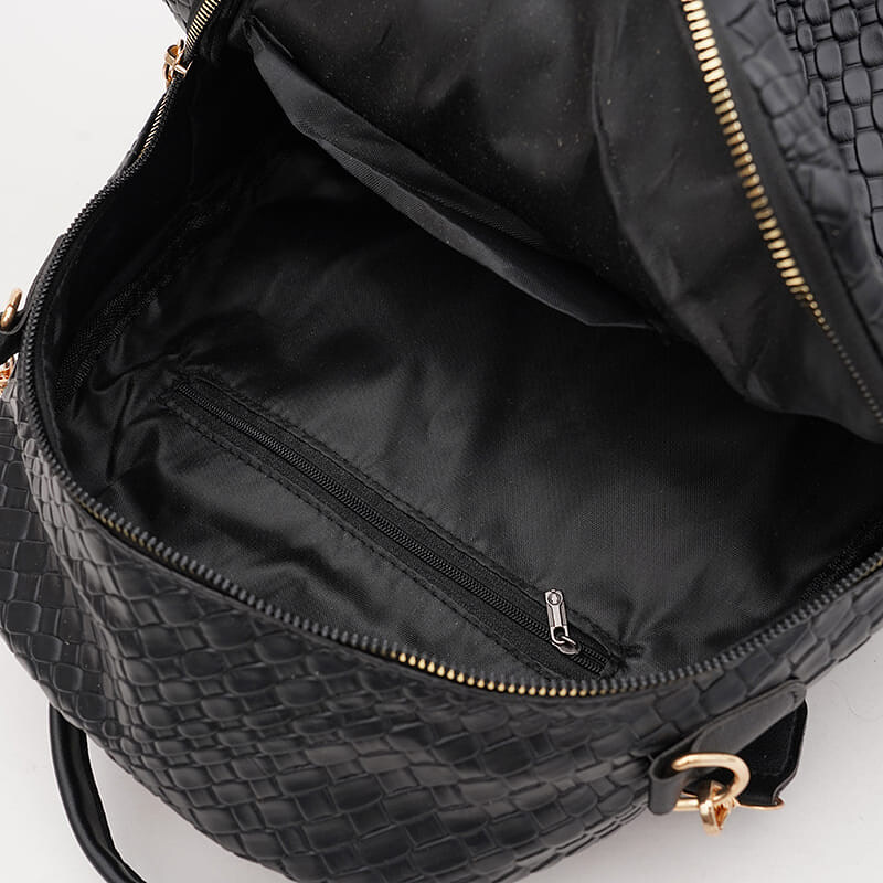 Женский рюкзак имеет 1 основное отделение, которое закрывается на молнию. С тыльной стороны есть 1 карман на молнии и 2 боковых кармана на молнии. Внутри - 1 карман на молнии и 1 карман для телефона или других мелочей. Подкладка текстиль. В комплекте есть съемный плечевой ремень. Ручки выполнены из искусственной кожи.