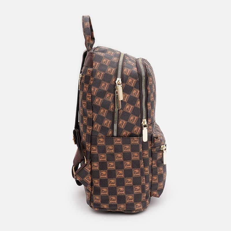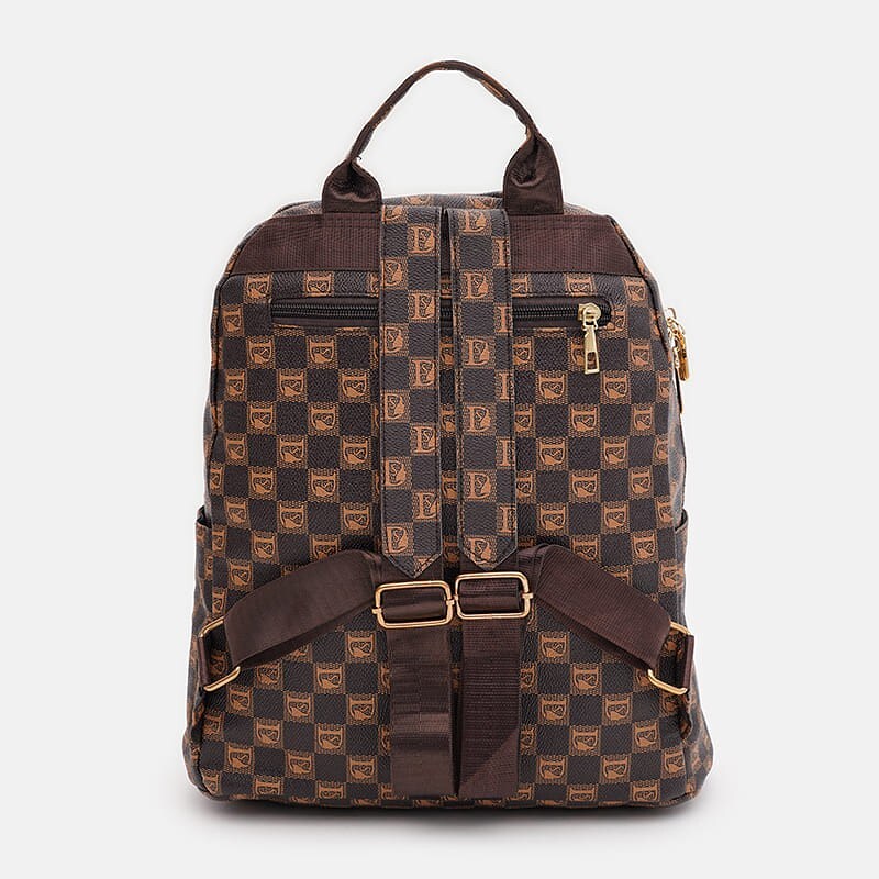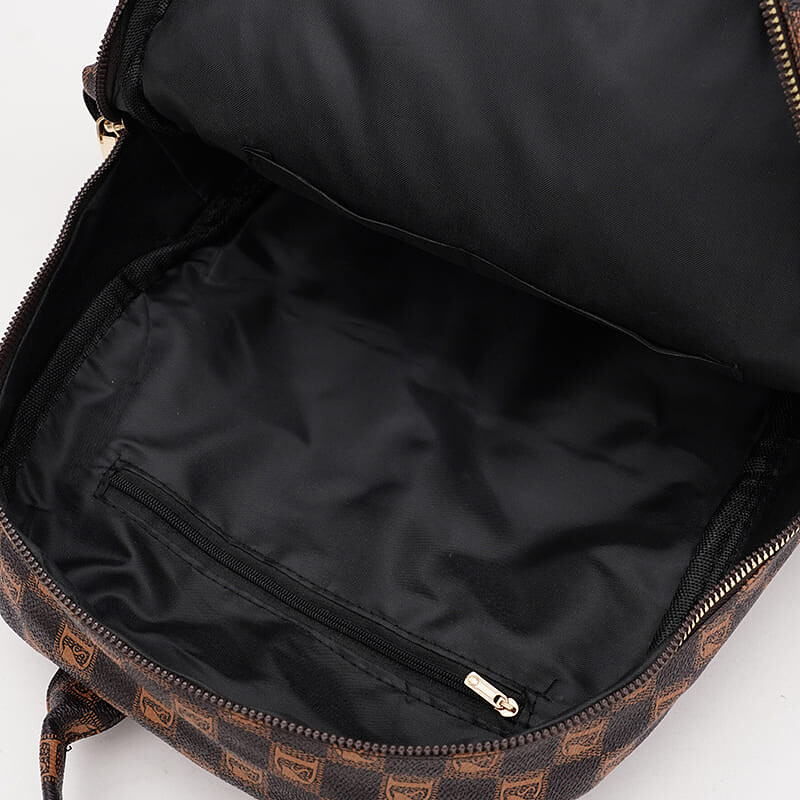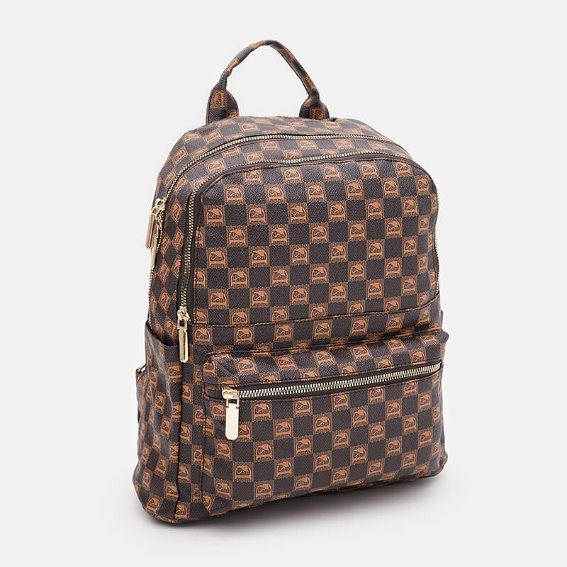 Женский рюкзак имеет 2 отделения, которые закрывается на молнию. С лицевой и тыльной стороны - по 1 карману на молнии, также имеются 2 боковых кармана. Внутри сумки - 1 карман на молнии и 2 кармана для телефона или других мелочей. Подклакдка текстиль. Ручки выполнены из искусственной кожи, плечевые ремни - из текстиля+искусственная кожа.