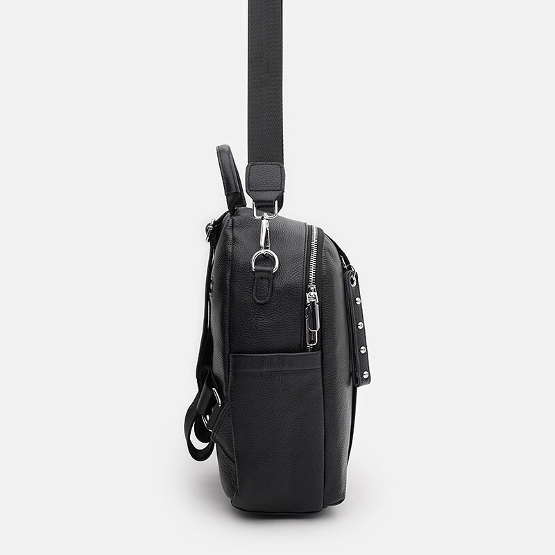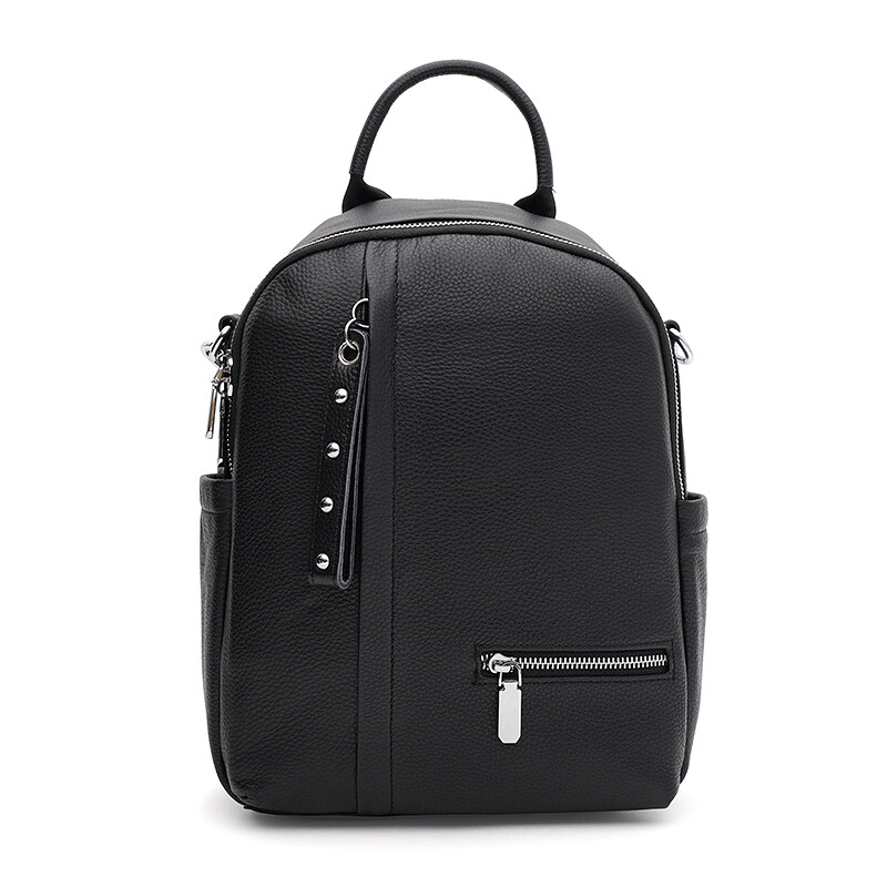 Женский кожаный рюкзак закрывается на молнию. Имеет 1 основное отделение на молнии. Внутри - 2 кармана на молнии. Снаружи-1 карман на молнии; с лицевой стороны-2 кармана на молнии и 2 боковых кармана. Подкладка текстиль. Несъемные плечевые лямки регулируются по длине, съемный ремень-текстиль, несъемная ручка-кожа.