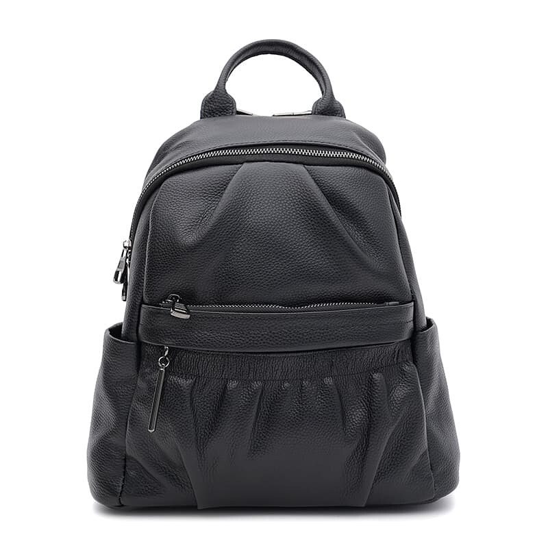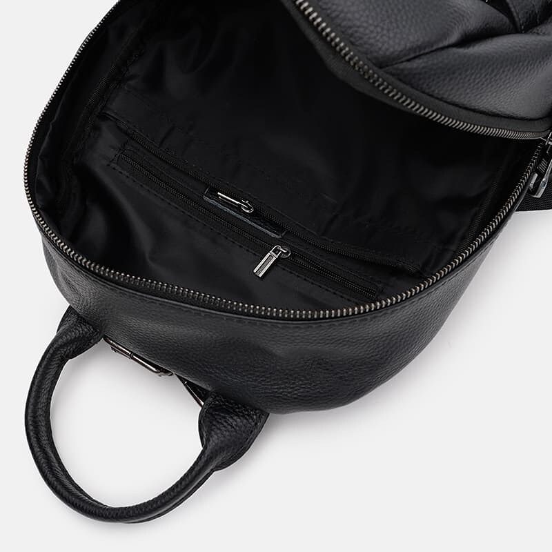 Женский рюкзак выполнен из натуральной кожи. Имеет 1 основное отделение на молнии. Внутри 4 кармана для телефона и других аксессуаров. С лицевой стороны-2 кармана, с тыльной-1 карман. Подкладка-текстиль. Лямки ругулируются по длине, ручка из кожи.