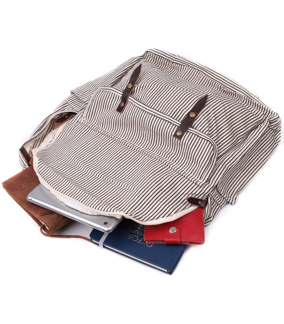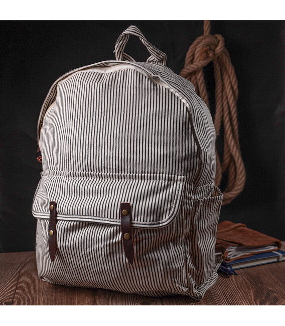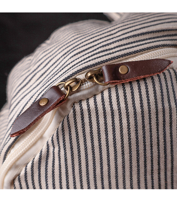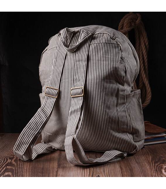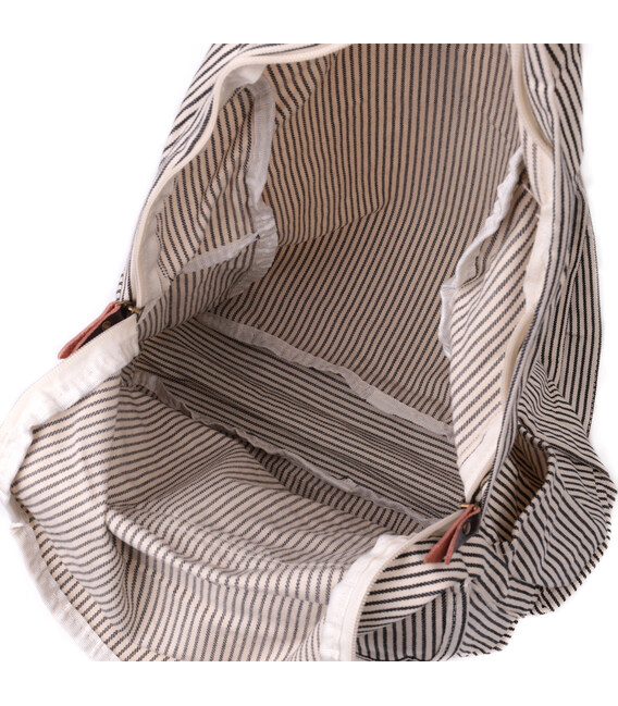 Универсальный рюкзак молочного цвета в черную вертикальную полоску из качественного текстиля. Рюкзак очень вместительный и имеет очень практичный функционал. Носить изделие можно в руках, для этого предусмотрена текстильная ручка, а также на спине благодаря регулируемым текстильным лямкам. Фурнитура которая использована в рюкзаке качественная, прослужит не один год.