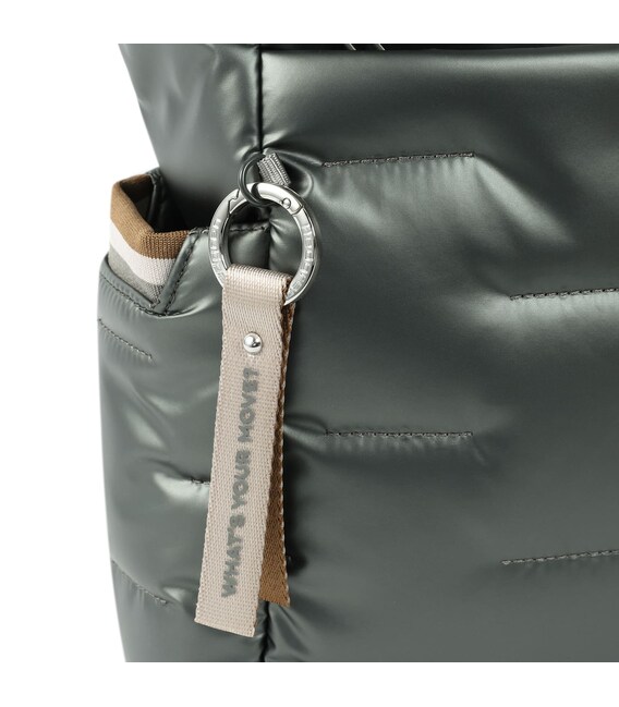 Вместительный, дутый рюкзак-идеальный спутник на каждый день. Оснащен большим основным отделением с внутренними карманами и съёмной косметичкой. С внешней стороны расположен карман на молнии, также есть боковые карманы для зонтика или бутылки с карабином для ключей. Выполнен из плотного 100% polyester.