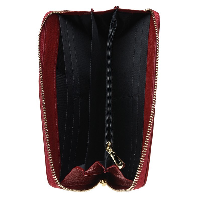 Данная модель кожаного кошелька закрывается на молнию. Внутри - 5 отделений под купюры, 8 отделов под карты и 1 отдел -монетница. Подкладка-текстиль.