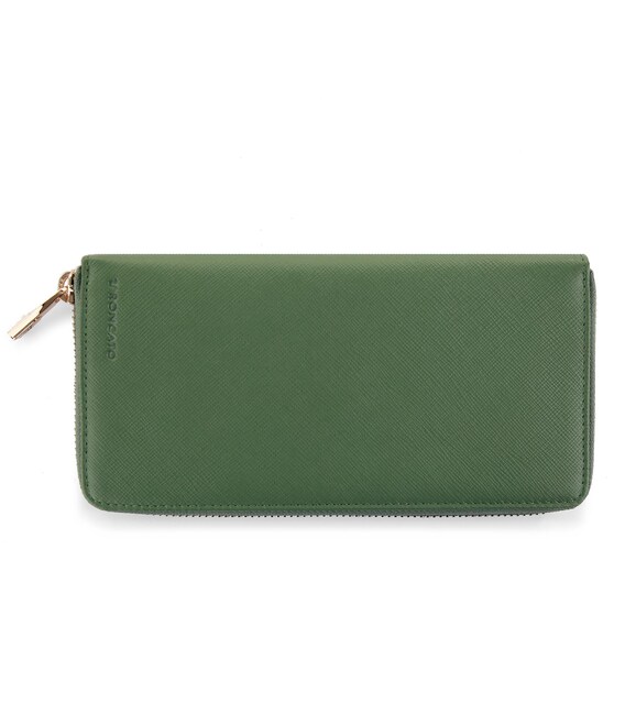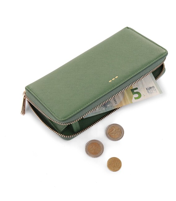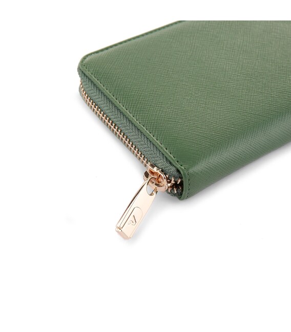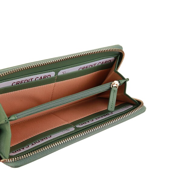 Стильный аксессуар, закрывается внешней металлической молнией, идущей по всей боковой стороне. В кошельке имеется два больших отделения для купюр в полный размер, отделение для мелочи, закрывающееся на молнию и отделения для кредитных карт с RFID-защитой от мошенничества.