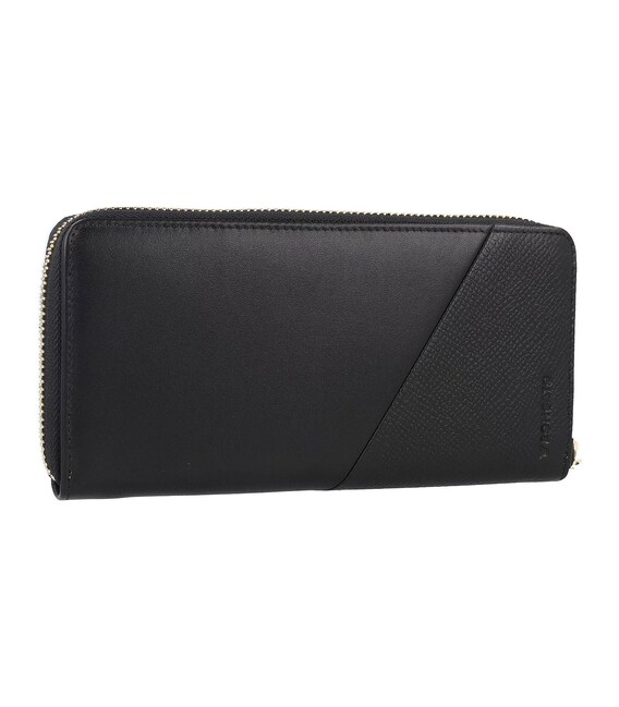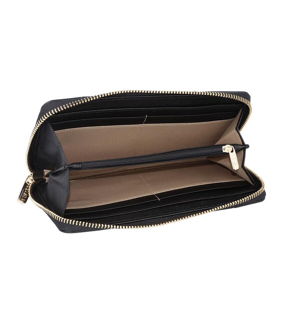 Кошелек имеет два отделения для банкнот, восемь слотов для кредитных карт, карманы для документов, также карман на кнопке-застежке для мелочи.