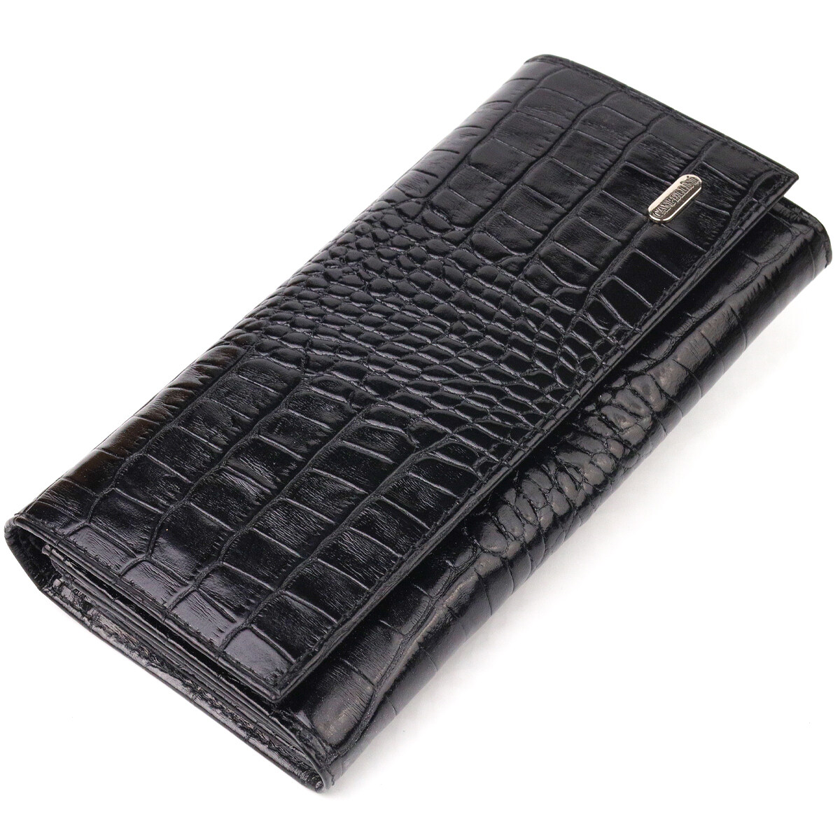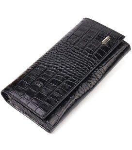Изделие выполнено из натуральной фактурной кожи черного цвета с тиснением под крокодила. Материал выглядит эффектно, приятен на ощупь и хорошо подходит для ежедневного использования. Горизонтальный формат делает модель удобной для тех, кто ценит вместительность и порядок в вещах.