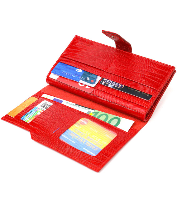 Женский яркий кошелек, из натуральной фактурной кожи. Аксессуар имеет шесть прилегающих карманов, в которые поместятся купюры всех номиналов, вместительную монетницу и двадцать карманов для карточек. Закрывается аксессуар хлястиком на кнопку. Если Вы хотите порадовать и себя и удивить близких, то непеременно покупайте кожаные аксессуары в нашем магазине, качество и цена Вас однозначно порадует.