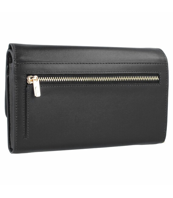 Стильный аксессуар, закрывающийся с помощью клапана, где расположена кнопка-застежка. Изделие имеет несколько отделений для купюр в полный размер, отделение для мелочи, закрывающееся на молнию и отделения для кредитных карт с RFID-защитой от мошенничества.