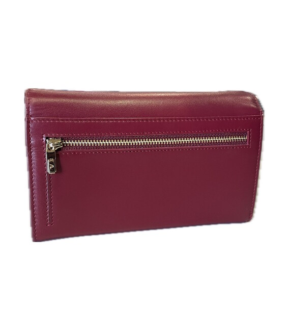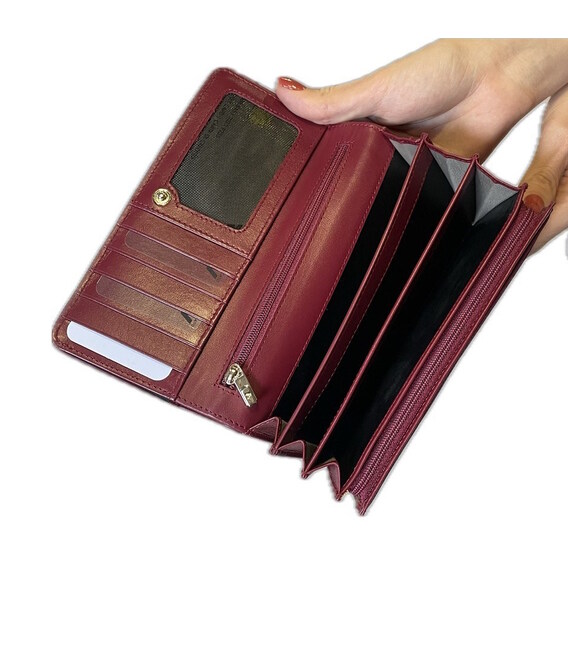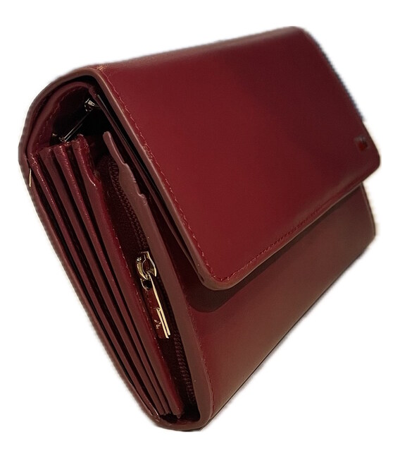 Стильный аксессуар, закрывающийся с помощью клапана, где расположена кнопка-застежка. Изделие имеет несколько отделений для купюр в полный размер, отделение для мелочи, закрывающееся на молнию и отделения для кредитных карт с RFID-защитой от мошенничества.
