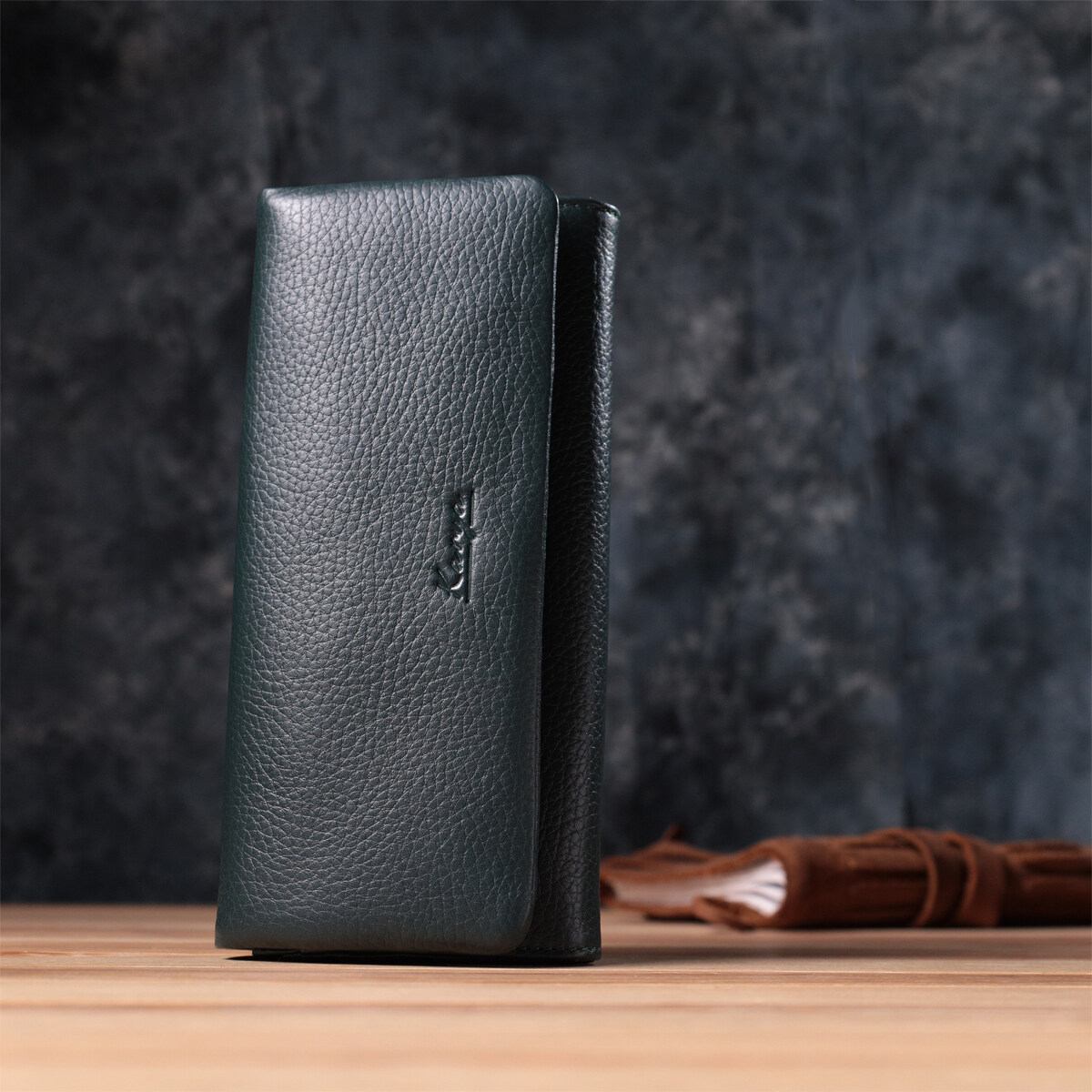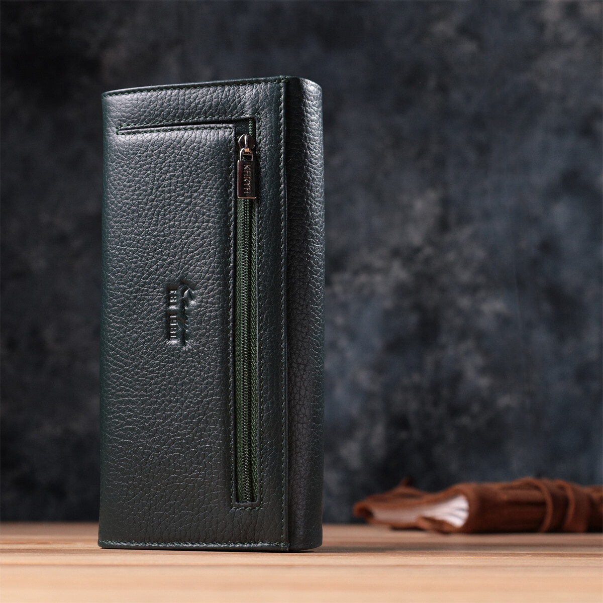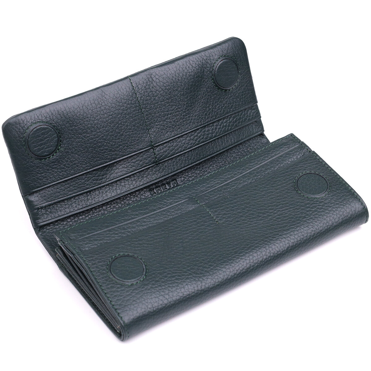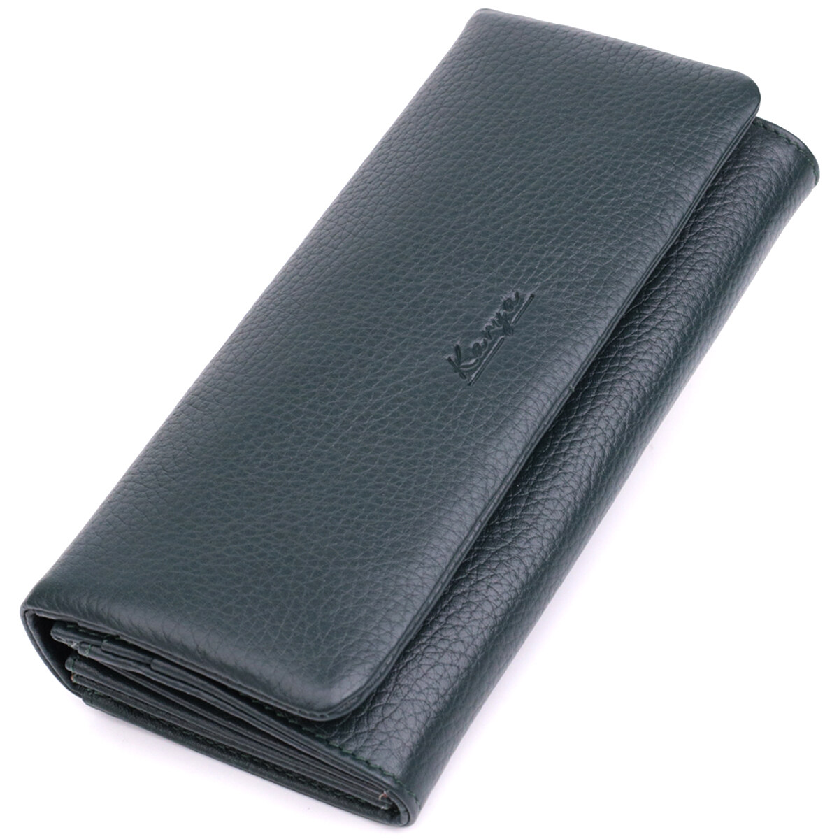 Практичный женский кошелек из натуральной кожи. Модель создана в красивом зеленом цвете. Кошелек удобно лежит в руке. Дизайн кошелька продуман для удобства любой девушки. В кошелек Вы сможете разместить все ваши деньги, карточки и визитки. На лицевой стороне аксессуара тиснение логотипа бренда. В комплекте к кошельку идет фирменная картонная упаковка. Кошелек от турецкого бренда станет прекрасным подарком для любой девушки.