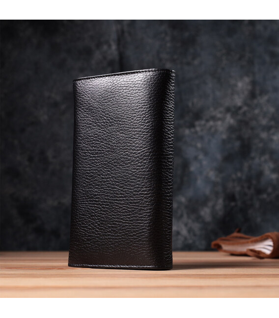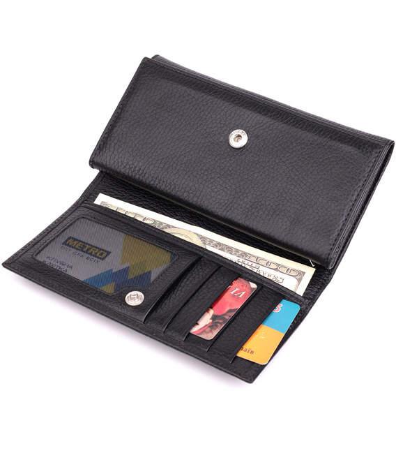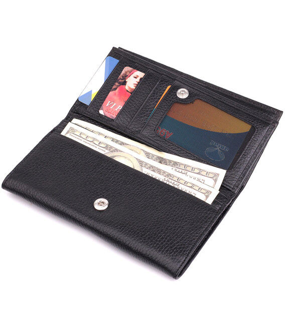 Отменный женский кошелек из натуральной зернистой кожи, в классическом черном цвете. Изделие состоит из двух автономных отделений, которые закрываются клапанами на кнопку. Внутри представлено множество карманов, в которых можно удобно разложить купюры, пластиковые карточки и документы. Такой кошелек из натуральной кожи - это идеальный вариант на каждый день для тех, кто ценит качество, удобство и комфорт, а также будет отлично дополнять Ваш повседневный образ.