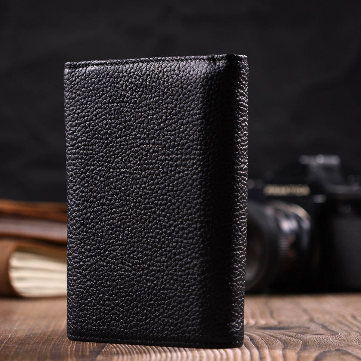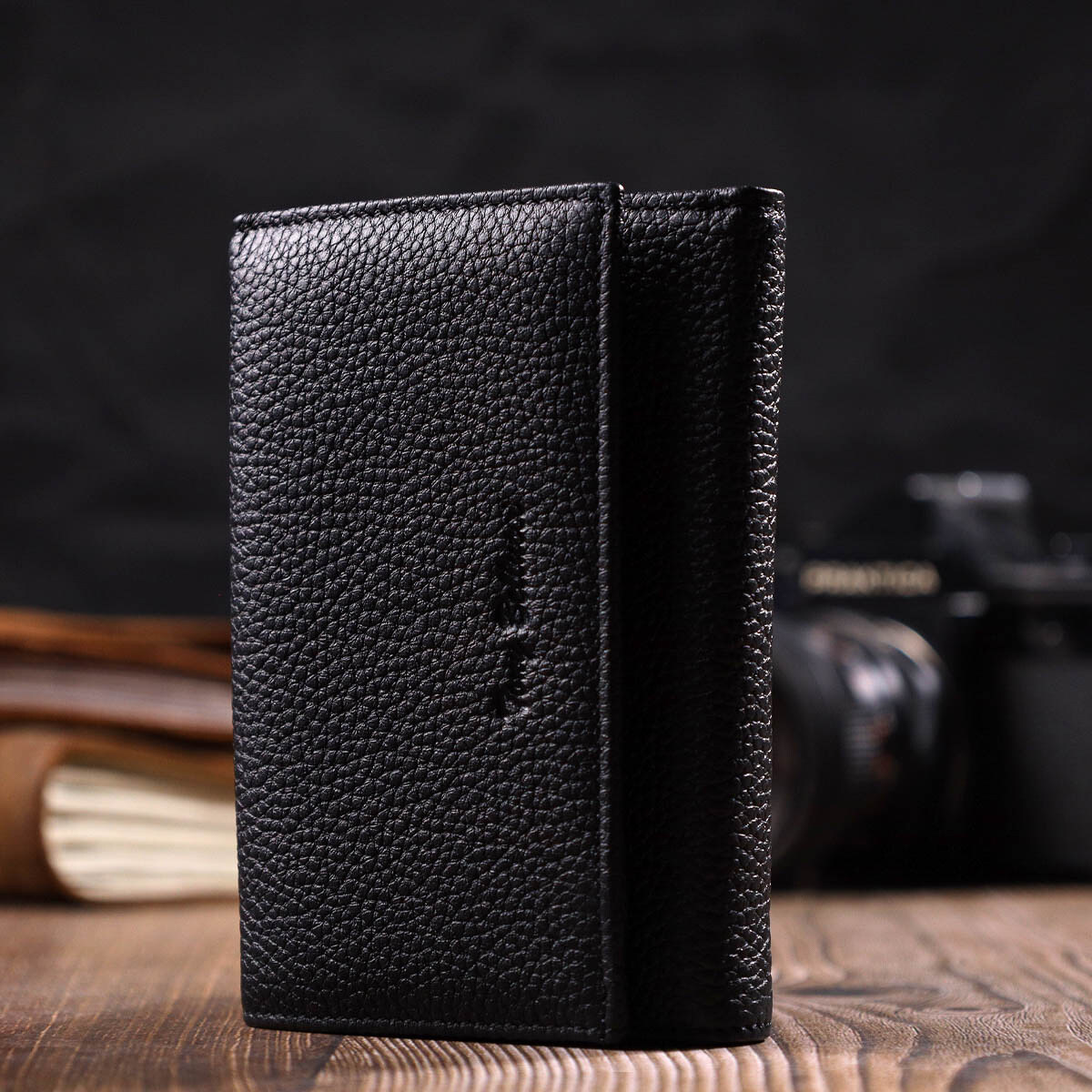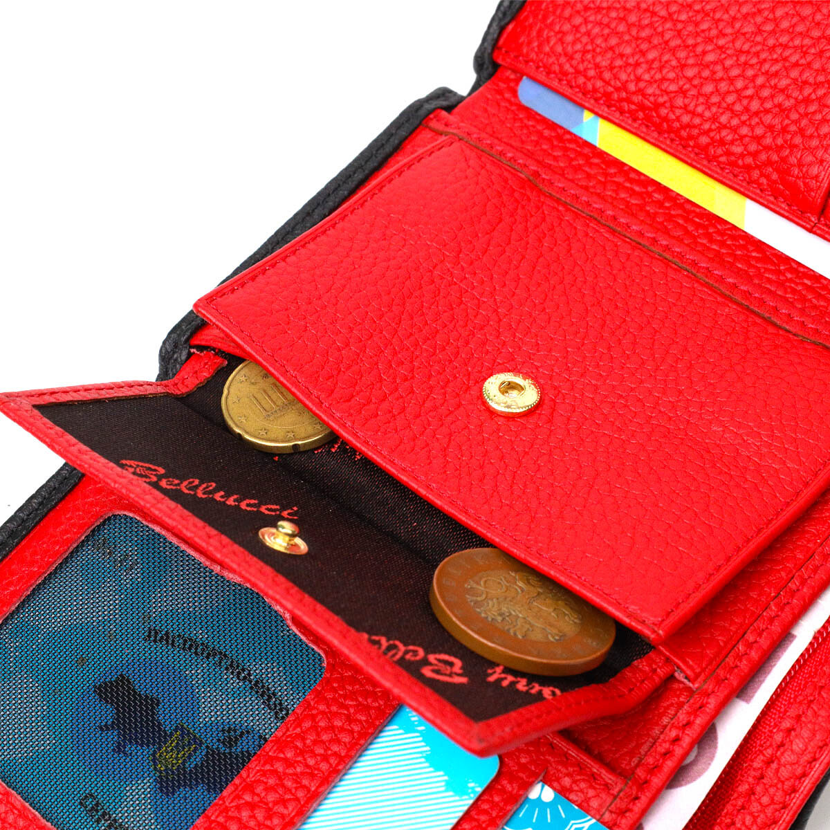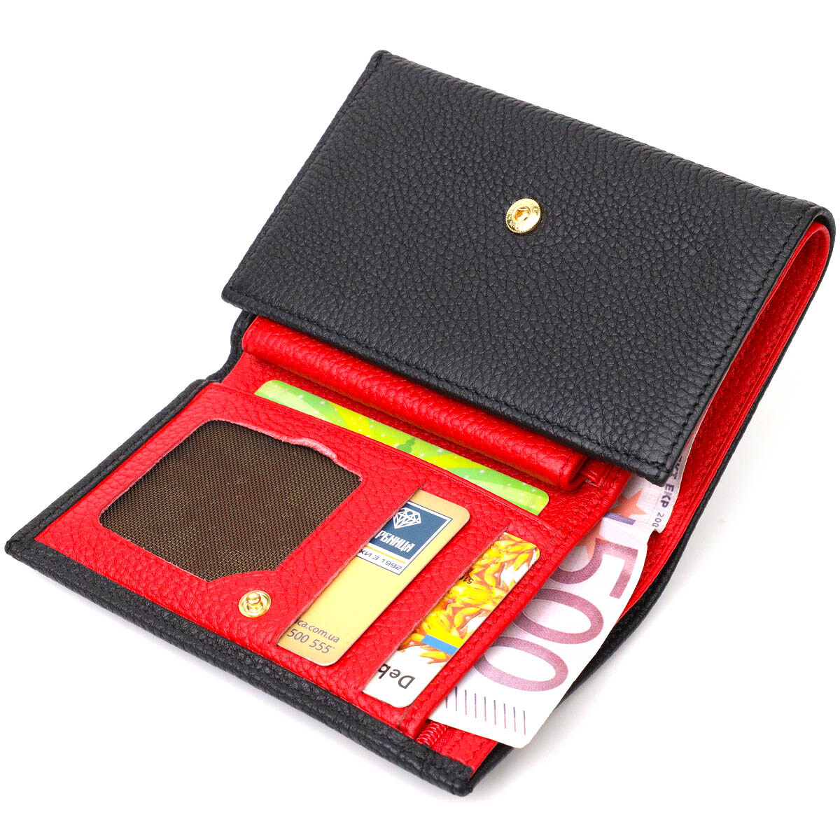 Оригинальный кошелек из натуральной кожи, в комбинации кожи двух цветов: черный - снаружи и красный - внутри. Аксессуар состоит из двух вместительных отделений для купюр, семь ячеек для пластиковых карт, кармашка на молнии, трех прилегающих карманов и монетницы. В изделии использована качественная фурнитура. Закрывается кошелек в три сложения на кнопку.