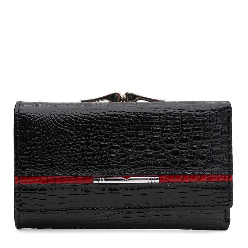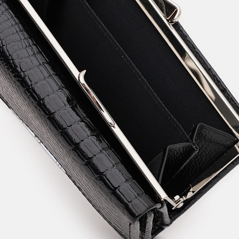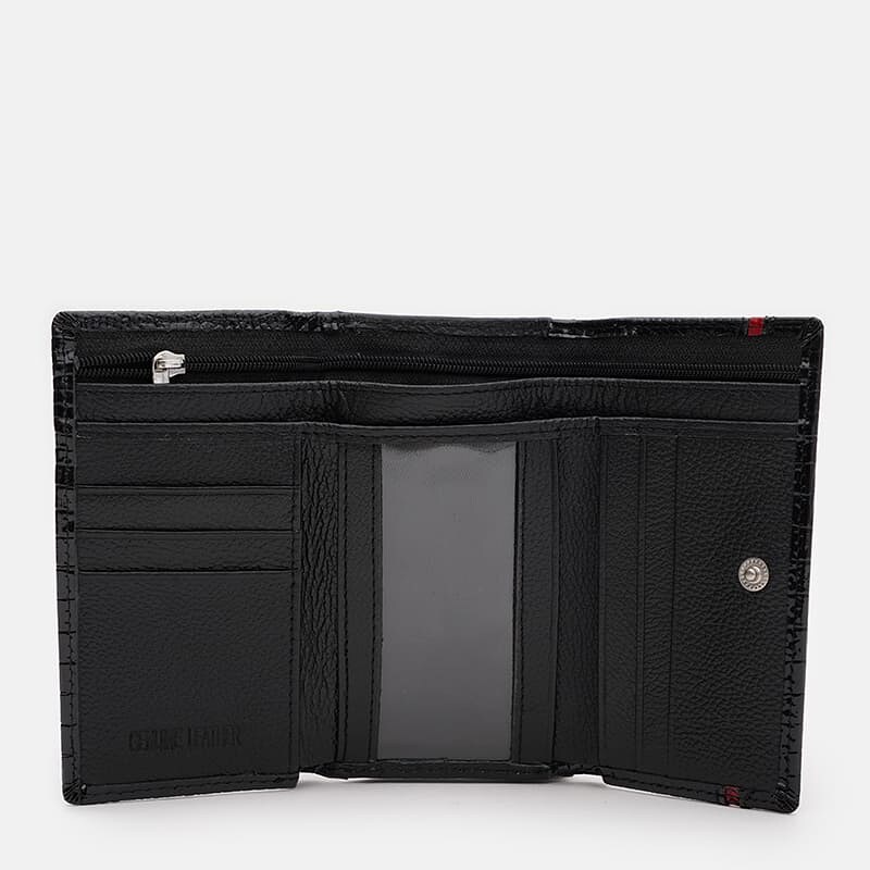Эта модель женского кошелька – воплощение элегантности и удобства. Закрывается на кнопку. Внутри находятся два отделения для купюр и дополнительное на молнии, 7 отделов под карты, 1- монетница с тыльной стороны кошелька. Подкладка: Текстиль.
