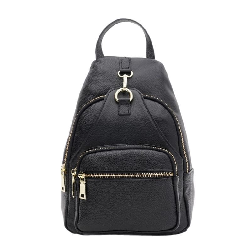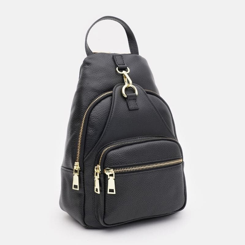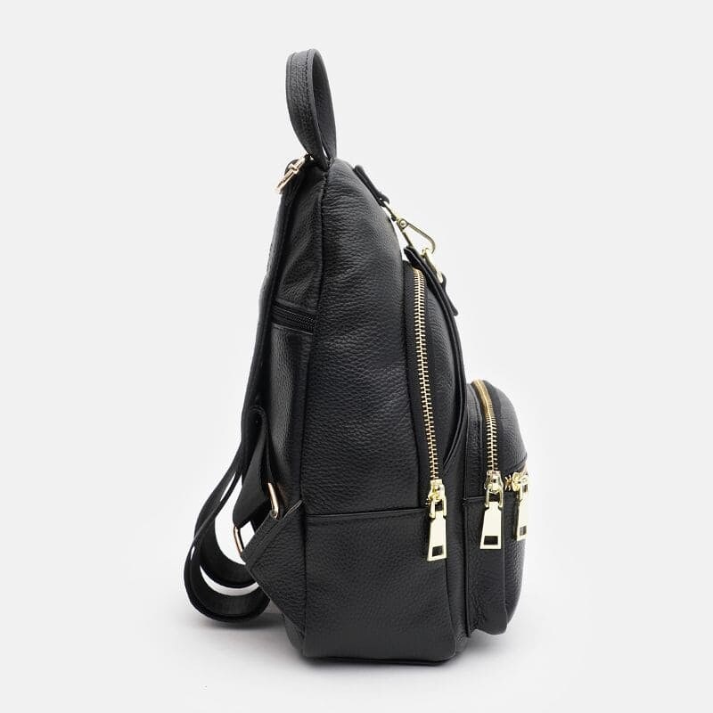 Женский кожаный рюкзак закрывается на молнию, имеет 1 основное отдление, внутри 3 кармана для телефона и мелочей. Снаружи имеется 3 кармана на молнии. Подкладка-текстиль. Цвет фурнитуры-золото. Фурнитура-металл. Плечевые ремни трансформируются с помощью молнии, отстегиваются и регулируются по длине.