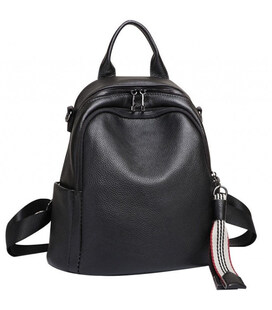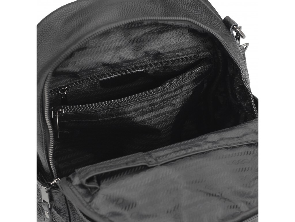 Женский рюкзак городского типа черного цвета с темной металлической фурнитурой и текстильным декоративным элементом. Передняя сторона с карманом на молнии, по бокам два открытых кармана. Внутри имеется карман для мобильного телефона и вшитый карман на молнии. Сзади карман на молнии. Дополнительно входит в комплект плечевой ремень.