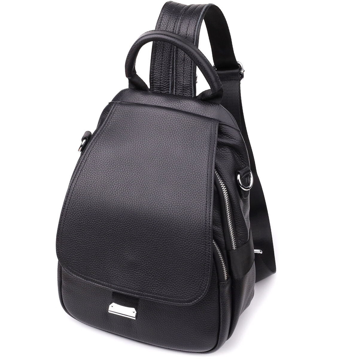 Женский кожаный рюкзак отличается стильным дизайном и удобной функциональностью. Основное отделение на молнии обеспечивает надежное хранение личных вещей, внутри которого находятся два кармана на молниях и один открытого типа для удобной организации. Накладной карман на лицевой стороне закрывается на молнию и дополнительно защищён клапаном на магнитах, который также закрывает основное отделение.