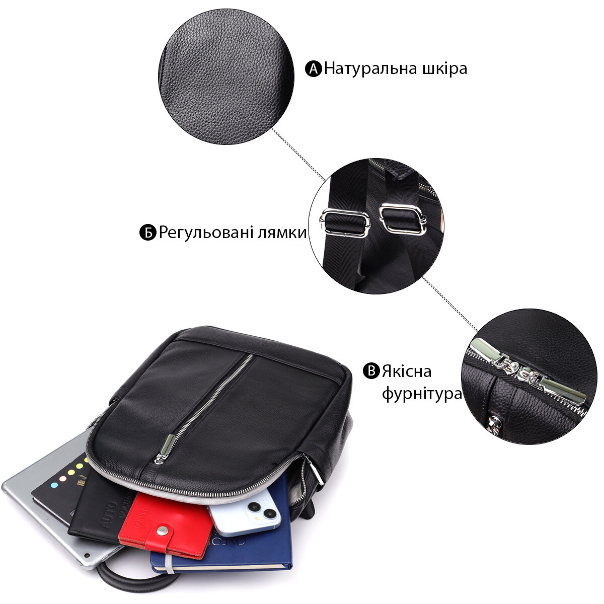 Для комфортной переноски предусмотрена прочная кожаная ручка, кожано-текстильные регулируемые лямки, а также текстильный ремешок, позволяющий носить рюкзак как сумку. Эта модель идеально подойдет для повседневного использования, сочетая удобство и современный дизайн.