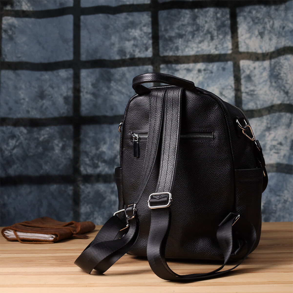 Женский кожаный рюкзак выполнен в функциональном и современном дизайне, идеально подходящем для повседневного использования. Он оснащён одним основным отделением на молнии, внутри которого предусмотрены два кармана на молниях и один открытого типа для удобного хранения необходимых вещей.