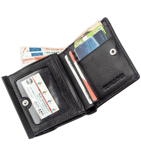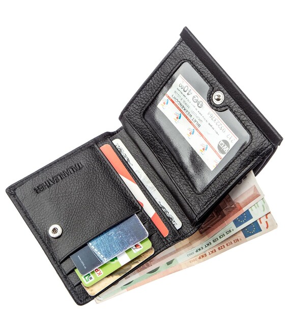 Небольшой практичный женский бумажник с добротной натуральной кожи высокого качества. Имеет универсальный черный цвет с матовым оттенком. Если Вы не являетесь поклонником больших и громоздких кошельков, то данное портмоне прекрасный выбор. Внутри кошелька расположено два основных отделения для купюр, отделение на молнии для особо ценных мелочей, карманы для фото близких людей и конечно же карточек и визиток. Монетница в данной модели находится на тыльной стороне и имеет два отделения, закрывается на металлическую кнопку. Такой бумажник может стать замечательной обновкой не только для себя, но и отличным подарком для дорогого человека. Продается аксессуар в белой картонной коробке с фирменным логотипом.