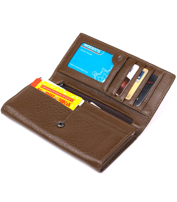 Стильный и в то же время лаконичный дизайн оценит любая девушка. Кошелек выполнен в коричневом цвете с зеленоватым оттенком. Модель горизонтального плана имеет оптимальный функционал и правильно подобранные размеры. По краям аксессуар прошит ровной строчкой. Кошелек прекрасно подойдет в качестве подарка для любой девушки. Изделие упаковано в картонную коробку красного цвета.