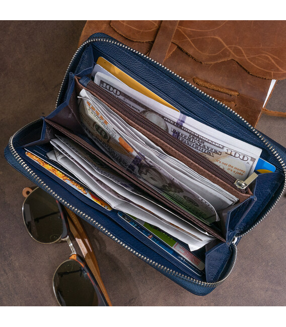 Самый удобный и самое главное вместительный женский кошелек. Выполнена модель в темно-синем приглушенном цвете из натуральной мягкой и эластичной кожи.В модели две автономных части (под купюры и вторая под кредитки). Кошелек вы можете носить как клатч с помощью ремешка на запястье. Его современный и продуманный дизайн не оставит вас равнодушной. С таким изделием вы можете быть уверены, что купюры не помнутся и будут в полном порядке. Стоит отметить, что в модели достаточно отделений, чтобы разложить все деньги карточки и даже вместить телефон. Внутри изделие изготовлено из натуральной кожи в сочетании с плотным текстилем. Кошелек упакован в фирменную картонную коробку белого цвета. Рекомендуем вам данную модель, если вы находитесь в поиске подарка для девушки.