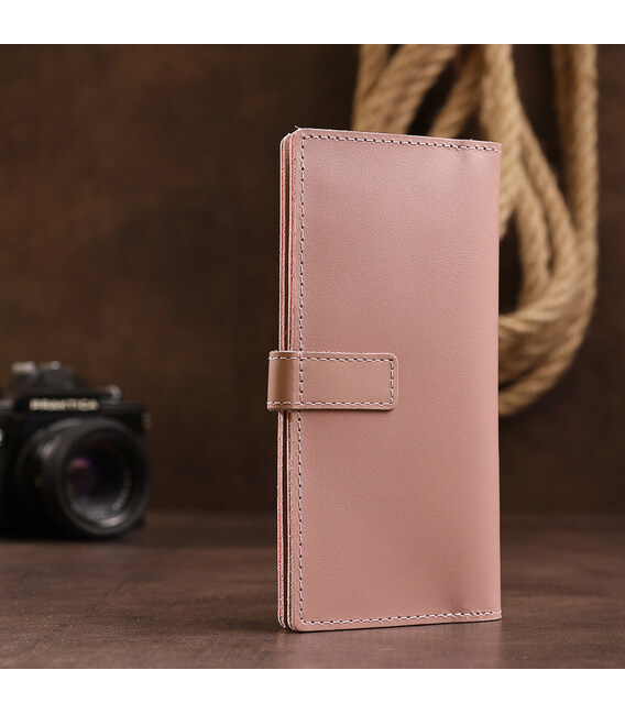 Стильное женское портмоне в нежном розовом цвете от известного производителя. Материал изготовления – натуральная кожа с высокими показателями прочности и износоустойчивости. Наполнение представлено в виде вместительных отделения для купюр, удобной монетницы на молнии и слотов для различных карт и визиток. Закрывается изделие на кожаный хлястик с кнопкой.