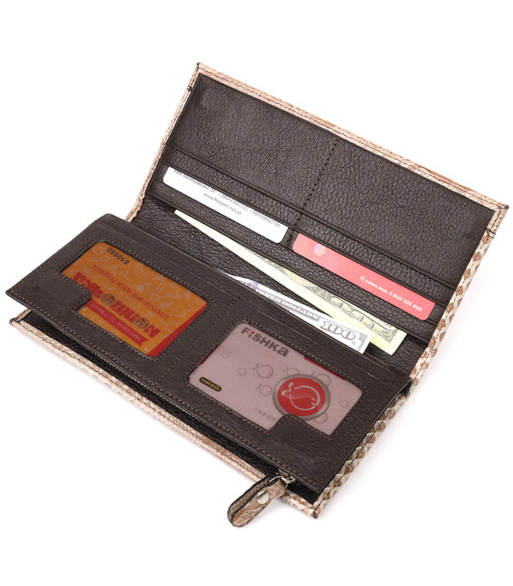 Стильный женский кошелек из лакированной натуральной кожи, с тиснением под рептилию. На лицевой стороне блок для карточек, который прошит белой нитью для декора и закрывается хлястиком на кнопку. Внутри отделения для карт и документов что закрывается на магниты. Отделение на молнии для купюр без сложения. Упакован аксессуар в фирменную коробку и пакет бренда. Изделия из натуральной кожи всегда будут отличным подарком для близкого человека.
