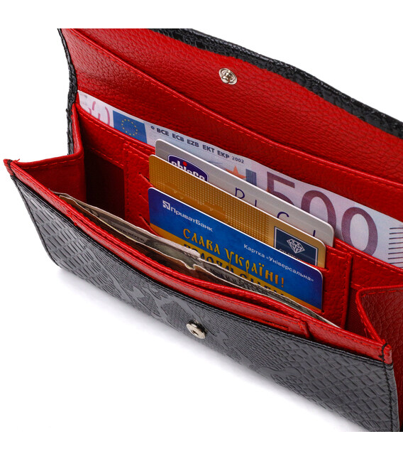Черный лакированный женский кошелек горизонтального типа из качественной натуральной кожи с тиснением под рептилию. Аксессуар имеет одно основное отделение, шесть карманов для карточек, четыре прилегающих кармана и монетницу. Закрывается аксессуар пополам клапаном на кнопку. Приобретая кожаный аксессуар этой фирмы, себе или на подарок, будьте уверены, что он прослужит Вам не один год.