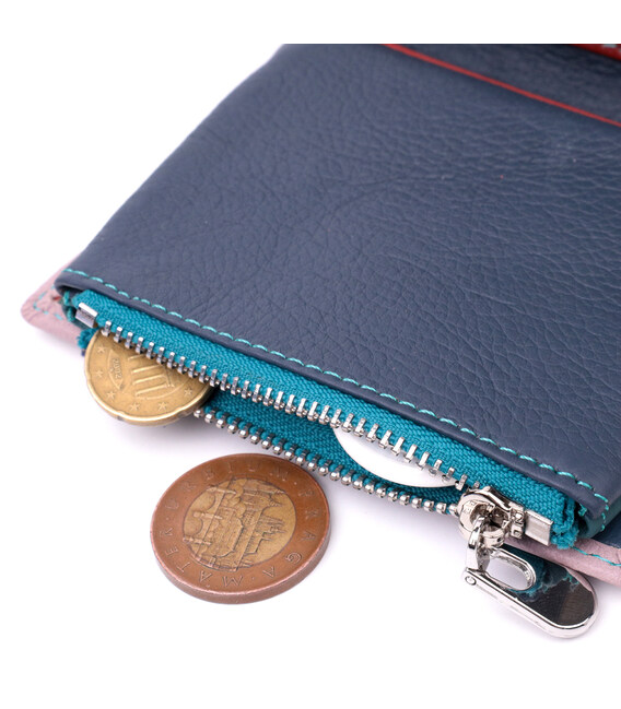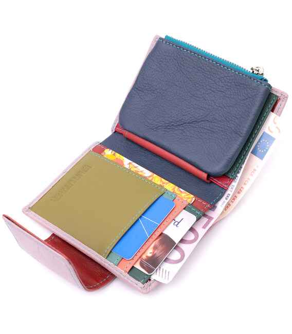 Красивое вертикальное портмоне в два сложения удобного размера из натуральной кожи высочайшего качества. Кошелек бежево-розового цвета снаружи и разноцветный внутри, что очень стильно и современно. Кожаное портмоне очень практичное и служит достаточно долго. Аксессуар состоит из основного отделения с кожаной перегородкой для купюр, монетницы, четырех ячеек для карт, прозрачного окошка для пропуска и четырех скрытых карманов. Портмоне дополнено надежной фурнитурой и прошито по краю ровной строчкой бирюзового цвета. Укомплектован кошелек в фирменную картонную коробку белого цвета. Изделие станет идеальным подарком для девушки любого возраста.