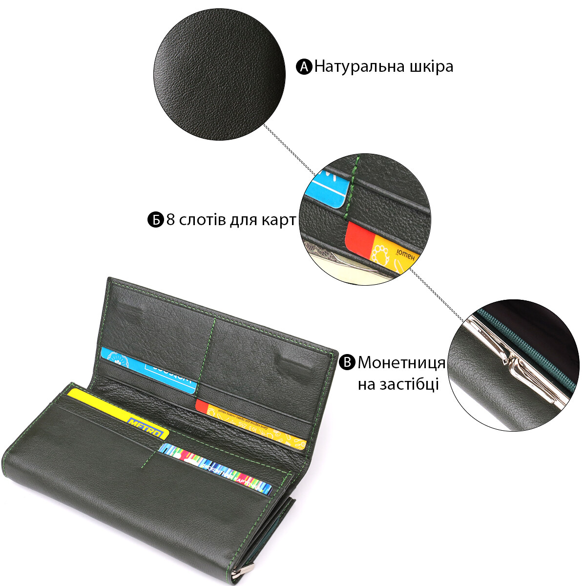 - 1 карман для монет на механической защелке снаружи;