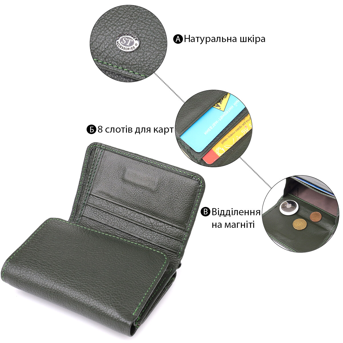 - 1 карман для монет, что закрывается на магнит;