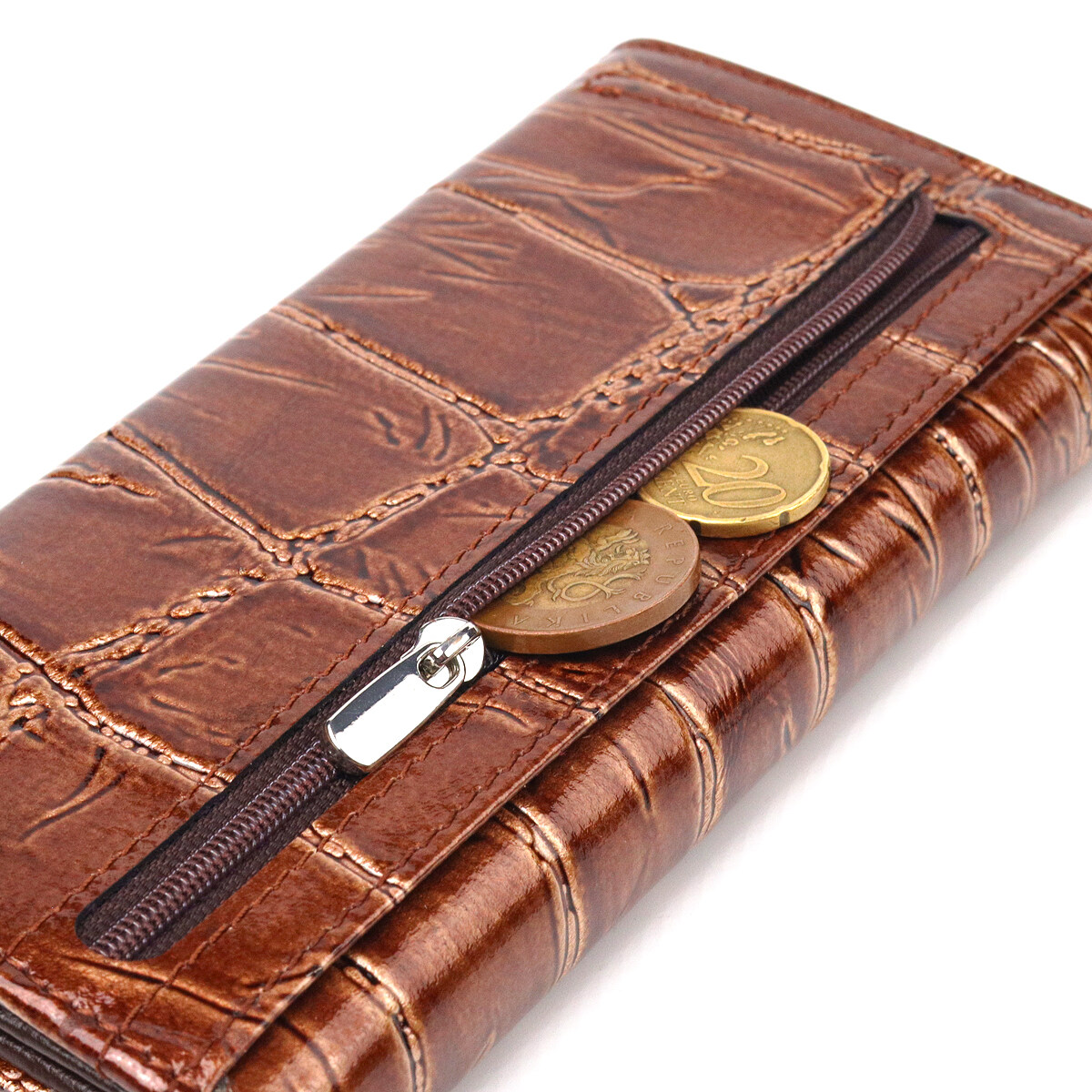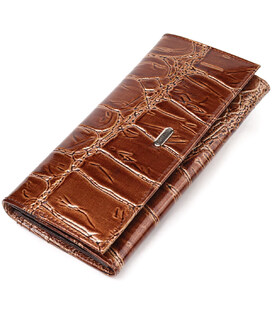Фактурный женский кошелек, из натуральной кожи, с крупным тиснением под крокодила. Аксессуар имеет три широких отделения для купюр, с двумя перегородками, одна перегородка закрывается на молнию, вместительную монетницу снаружи, четыре скрытых кармана и шесть карманов для карточек. Закрывается аксессуар клапаном на кнопку. Если Вы хотите порадовать и себя и удивить близких, то непеременно покупайте кожаные аксессуары в нашем магазине, качество и цена Вас однозначно порадует.