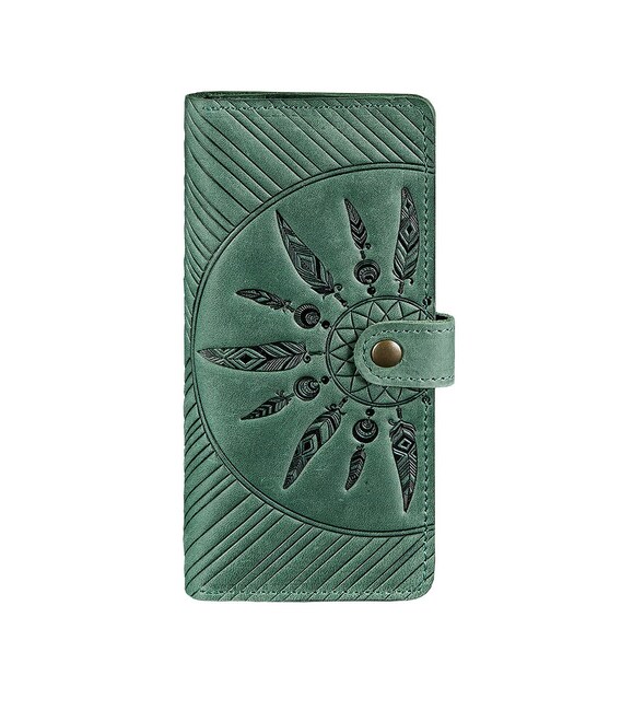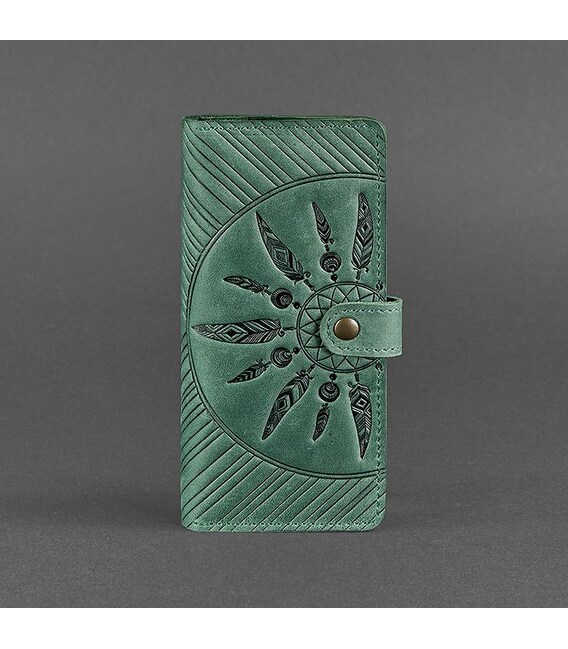 Портмоне «Инди» в изумрудном цвете подкупает оригинальным дизайном, высоким качеством и функциональностью.Оригинальной тиснение в виде ловца снов не только выглядит отлично, но и защитит Ваши деньги от быстрого расходования и необдуманных трат. Мы уверенны, что индейцы не зря наделяли этот талисман мощнейшими магическими свойствами.Портмоне изготовлено полностью вручную из натуральной кожи.Внутри имеется два отделения для купюр и просторное отделение для монет, которое закрывается на металлическую молнию. Для карточек и визиток предусмотрено девять кармашков и два дополнительных мини-кармана для карточек-брелоков.Мы уверены, что это стильное и удобное портмоне будет радовать Вас долгие годы! И в подтверждение своей уверенности мы даем гарантию на изделие.Гарантия на портмоне - 3 года с момента покупки.ВНИМАНИЕ! Выделка данной кожи предполагает естественное появление на ней царапин и потертостей в ходе использования! От этого изделие становится более индивидуальным и приятным, это оценят настоящие поклонники винтажного стиля:) А так же первое время кожа может краситься при сильном трении об другие предметы - это особенность её выделки, постепенно этот эффект уменьшается, кожа полируется и приобретает чуть глянцевый эффект.Фурнитура и комплектация может быть изменена производителем