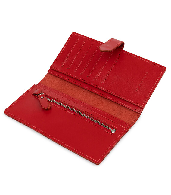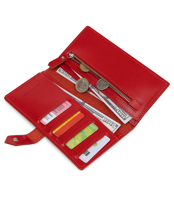 Красивое женское портмоне насыщенного красного цвета. Материал изготовления – натуральная износоустойчивая кожа высокого класса. Внутреннее наполнение представлено в виде четырех вместительных отделений для купюр, удобной монетницы на молнии и слотов для кредитных карт или визиток. Такое портмоне станет отличным подарком любимой женщине.