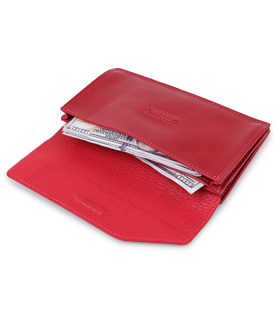 Стильное женское портмоне из высококлассной натуральной кожи в гладкой приятной на ощупь фактуре. Имеет красивый слегка приглушённый красный цвет, что смотрится просто шикарно. Внутри есть вместительные отделения для купюр, слоты для пластиковых карт и визиток, а также внешняя монетница на молнии. Закрывается портмоне оригинальным скошенным клапаном на магните.