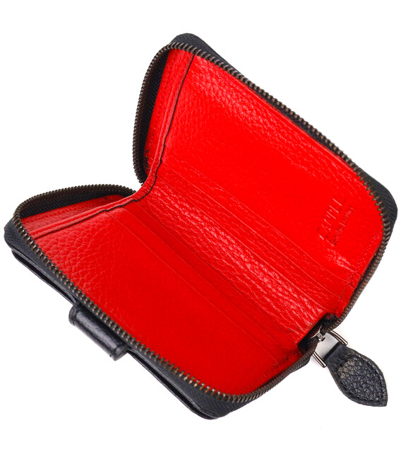 Стильный кошелек для женщин, из натуральной зернистой кожи. Аксессуар имеет одно основное отделение, в которое помещаются купюры всех номиналов, одиннадцать карманов для карточек, один из которых под сеточкой, блок для карт с внешней стороны, а также карман для пропуска, под сеточкой с лицевой стороны. Закрывается аксессуар на молнию, а блок для карт хлястиком на кнопку. Цвет фурнитуры – темное серебро. Кожаный кошелек является удивительным подарком для жены, девушки, подруги.