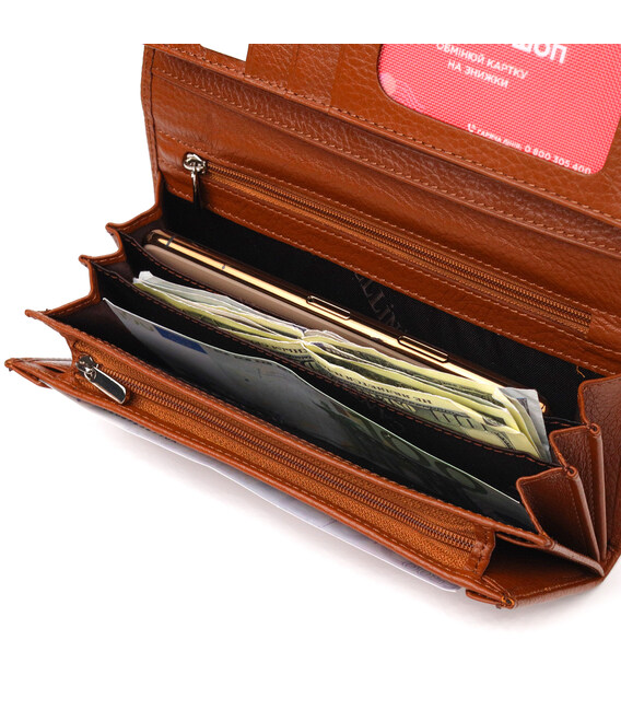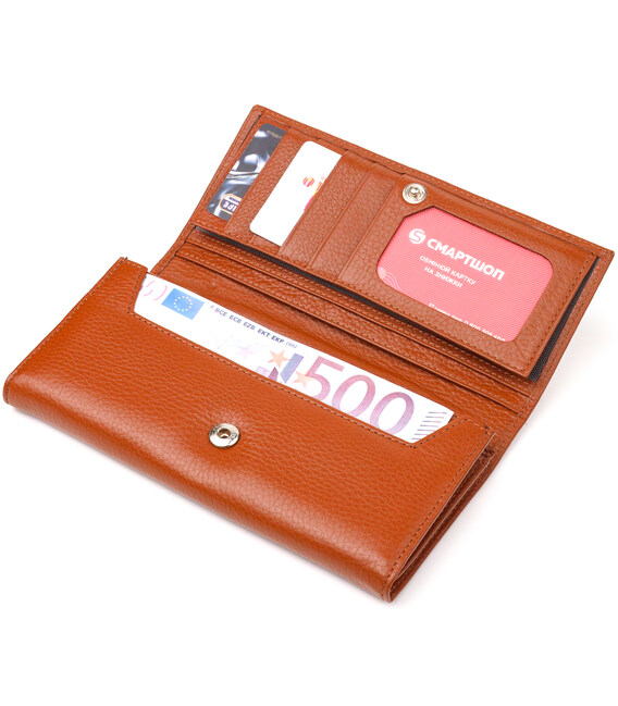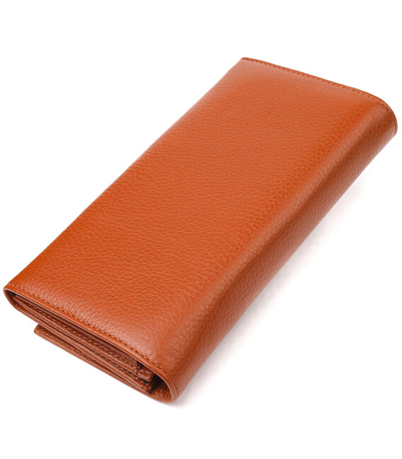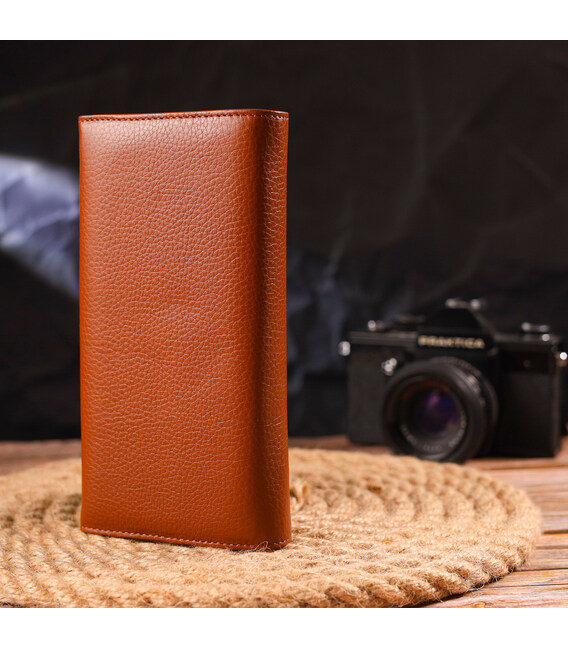 Удобный горизонтальный женский кошелек, из натуральной зернистой кожи, в стильном светло-коричневом цвете. Аксессуар имеет три больших кармана для купюр, три прилегающих кармана, восемь ячеек для карточек, три из них под сеточкой, монетницу на молнии. Изделие закрывается клапаном на кнопку. Отличная идея для подарка, которая не оставит равнодушной ни одну женщину.