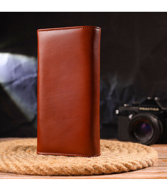 Изделие выполнено из натуральной гладкой кожи коричневого цвета. Материал выглядит стильно, приятен на ощупь и хорошо подходит для ежедневного использования. Горизонтальный формат делает модель удобной для тех, кто ценит вместительность и порядок в вещах.