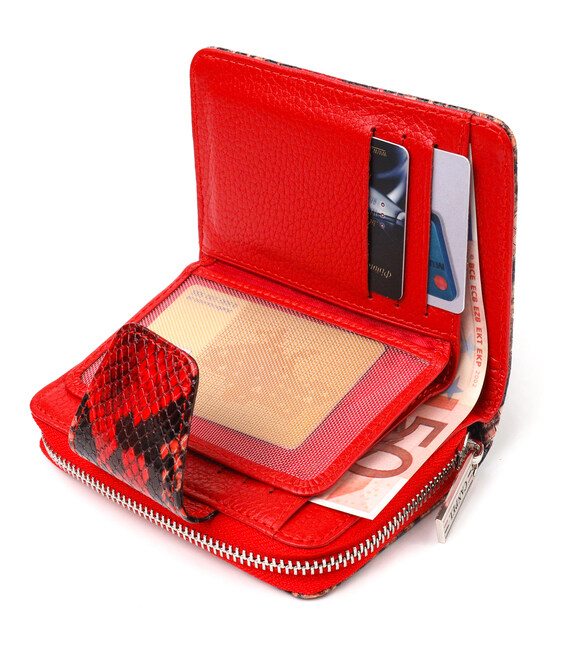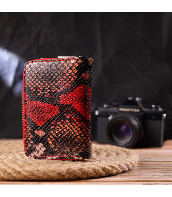 Стильный женский кошелек вертикального типа из натуральной кожи с тиснением под змею. Аксессуар имеет отделение для купюр, восемь ячеек для карточек (две под сеточкой), два прилегающих кармана и два кармана на молниях. Закрывается аксессуар в два сложения хлястиком на магнит. Приобретая кожаный аксессуар этой фирмы себе или на подарок, будьте уверены, что он будет радовать глаз не один год.