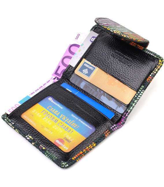 Женский фактурный кошелек из натуральной кожи, изделие имеет красочный цветочный принт снаружи и чисто черный внутри. Аксессуар состоит из одного основного отделения с тканевой перегородкой в которое помещаются купюры всех номиналов, четырех карманов для карточек (один под сеточкой), трех скрытых кармана и монетницы. Закрывается аксессуар пополам хлястиком на кнопку. Приобретая кожаный аксессуар этой фирмы, себе или на подарок, будьте уверены, что он прослужит Вам не один год.