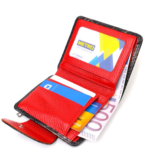Женский фактурный кошелек из натуральной кожи, изделие имеет красивый змеиный принт снаружи и красный внутри. Аксессуар состоит из одного основного отделения с тканевой перегородкой в которое помещаются купюры всех номиналов, четырех карманов для карточек (один под сеточкой), трех скрытых кармана и монетницы. Закрывается аксессуар пополам хлястиком на кнопку. Приобретая кожаный аксессуар этой фирмы, себе или на подарок, будьте уверены, что он прослужит Вам не один год.