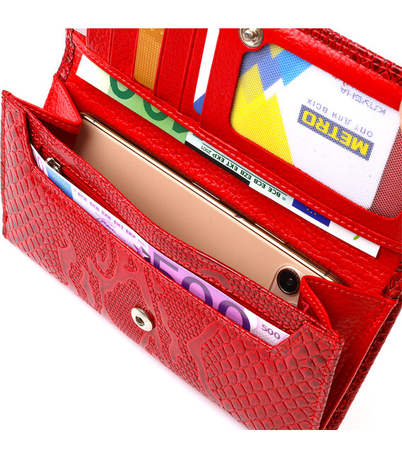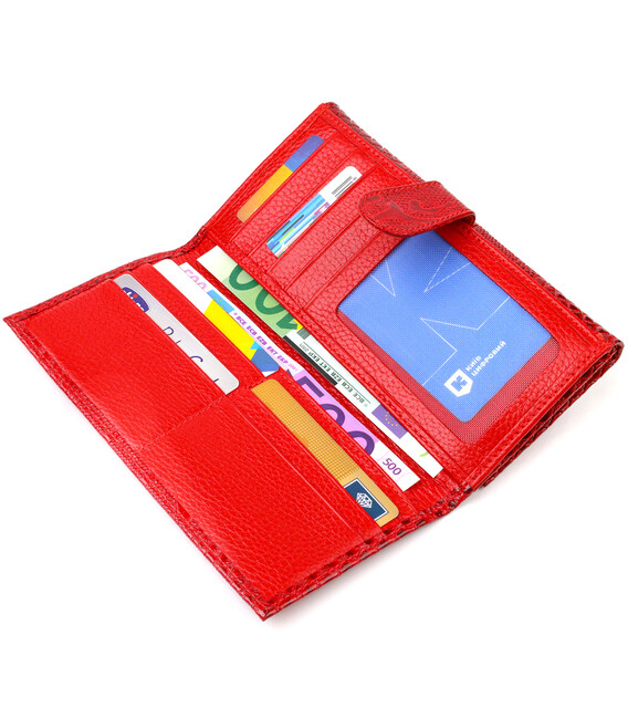 Яркий кошелек для женщин из натуральной кожи, с тиснением под рептилию. Аксессуар имеет одно основное отделение, семнадцать карманов для карточек, четыре прилегающих кармана и монетницу. Особенностью данной модели является наличие блока для кредитных карт, который закрывается хлястиком на кнопку. На лицевой стороне, в правом нижнем углу металлический логотип компании производителя. Если Вы выбрали товар этой фирмы, можете не сомневаться, что изделие прослужит очень долго и не потеряет свой первоначальный вид.