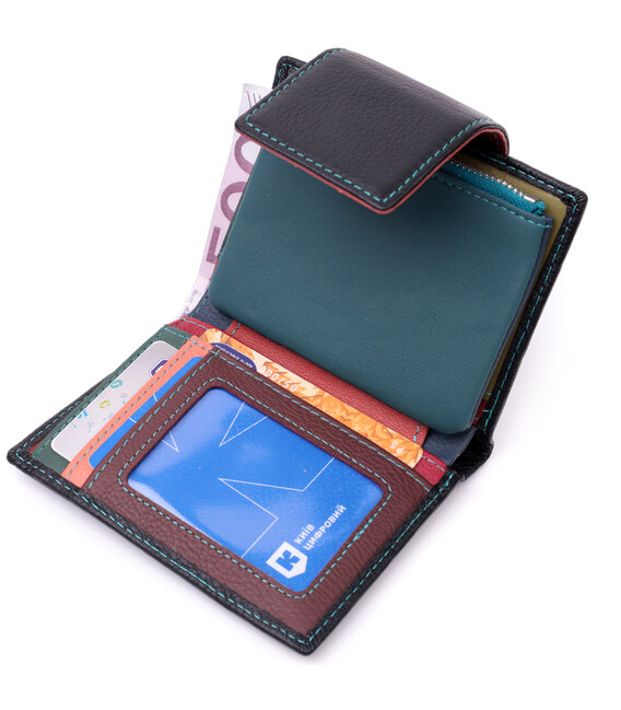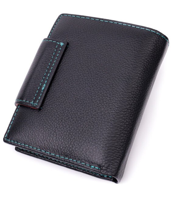 Модное вертикальное портмоне в два сложения удобного размера из натуральной кожи высочайшего качества. Кошелек черного цвета снаружи и разноцветный внутри, что очень стильно и современно. Кожаное портмоне очень практичное и служит достаточно долго. Аксессуар состоит из основного отделения с кожаной перегородкой для купюр, монетницы, четырех ячеек для карт, прозрачного окошка для пропуска и четырех скрытых карманов. Портмоне дополнено надежной фурнитурой и прошито по краю ровной строчкой бирюзового цвета. Укомплектован кошелек в фирменную картонную коробку белого цвета. Изделие станет идеальным подарком для девушки любого возраста.