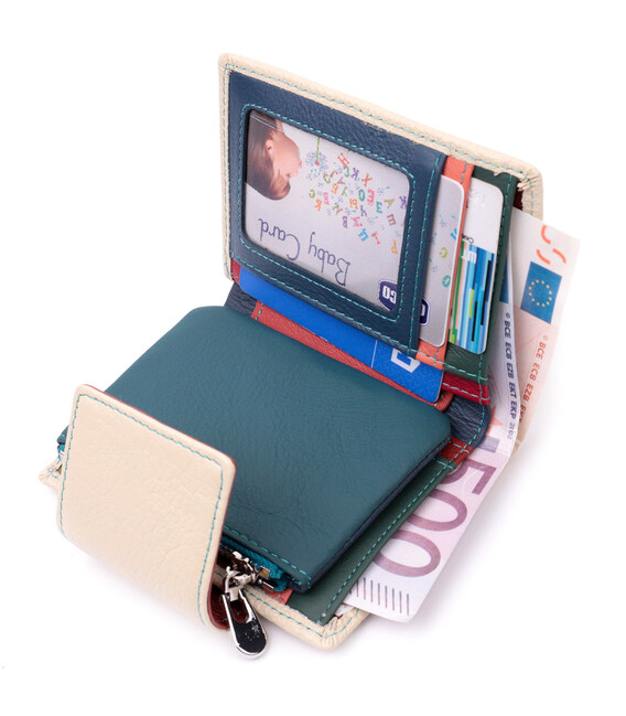 Стильное вертикальное портмоне в два сложения удобного размера из натуральной кожи высочайшего качества. Кошелек кремово-белого цвета снаружи и разноцветный внутри, что очень стильно и современно. Кожаное портмоне очень практичное и служит достаточно долго. Аксессуар состоит из основного отделения с кожаной перегородкой для купюр, монетницы, четырех ячеек для карт, прозрачного окошка для пропуска и четырех скрытых карманов. Портмоне дополнено надежной фурнитурой и прошито по краю ровной строчкой бирюзового цвета. Укомплектован кошелек в фирменную картонную коробку белого цвета. Изделие станет идеальным подарком для девушки любого возраста.